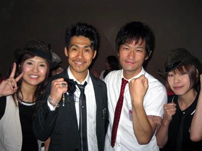 左から向こうで出会った初めましての三線歌手あびこめぐみちゃん、竜象兄さん、おいら、すきゃんぴみきちゃんです!