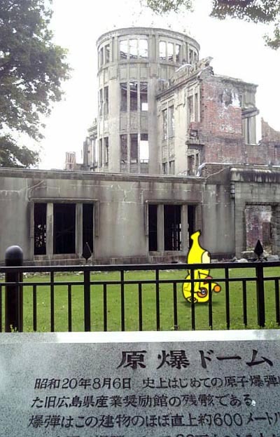 ってタヌキチ君、堂々の逆立ち(原爆ドームとのコラボレーション実現。ww)