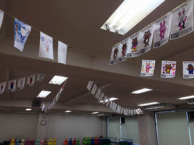 天井に子ども達が描いてくれた塗り絵が飾られていましたー٩(๑´0`๑)۶