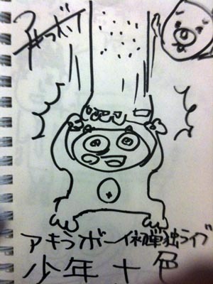 この前のライブでは2009年10月22日 ドーナツを頂いたのだー! ありがとー! よくライブに来てくれてるファンの一人に毎回絵を描いてるのやが、 あらためて見るとおもしろいのだー☆ 今回は誕生日バージョンw 毎回どーいう感じでネタをやったかを記してて、おいらのメモ帳にもなってるのだー☆ 単独ライブw ファンにも歴史ありやなーw またライブあったら来てねー! ブログPosted by akiraboy