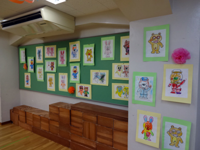 先日行った帝京めぐみ幼稚園にたくさんタヌキチくん達の塗り絵が飾られていたので、